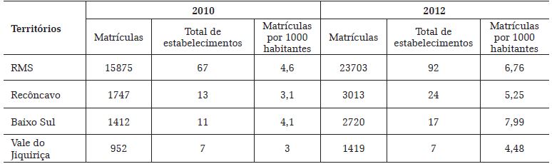 A Tabela 10 apresenta os números referentes à educação profissional nos quatro territórios de identidade, em 2010 e 2012. Houve um considerável avanço em termos de matrículas por habitantes nesse intervalo de tempo. Mesmo assim, em 2012, a situação não era confortável, com exceção do Baixo Sul. De fato, verifica-se que o Baixo Sul possuía, em 2012, uma relação entre população e matrículas superior à do Brasil, que era de 7,2, segundo o INEP, e à da Bahia (6,8).18 Nos outros territórios, a relação era menor do que a do Brasil e a da Bahia. Esses dados surpreendem, uma vez que se esperava que a RMS apresentasse melhor resultado. De qualquer forma, os números não parecem indicar que a oferta de pessoal qualificado tecnicamente, mesmo que em nível médio, possa representar fator de atração de investimentos nos territórios aqui considerados.