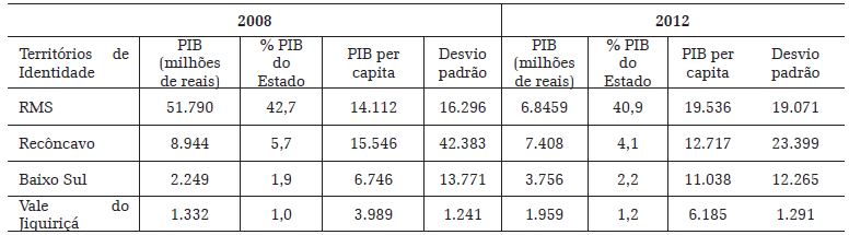 A Tabela 2 indica o crescimento do PIB per capita nos quatro territórios, em 2008 e 2012 (último ano disponível). Em primeiro lugar, cumpre destacar a alta concentração econômica na RMS, que, em 2012, respondia por 42,7% do PIB de todo o Estado. Em segundo, observa-se uma grande diferença do PIB per capita entre os territórios: em 2012, o da RMS era 3,15 vezes maior do que o do Vale do Jiquiriçá. Terceiro, observa-se que o território do Recôncavo teve seu PIB per capita reduzido de 2008 para 2012. Isso se deve, fundamentalmente, à queda no PIB de São Francisco do Conde, altamente concentrado na produção da Refinaria de Mataripe, que representava, em 2010, 57% do PIB de todo o território de identidade do Recôncavo. Considerando que o PIB per capita de todo o Estado, em 2012, foi de R$ 12.858,32, verifica-se que tanto o Baixo Sul como o Vale do Jiquiriçá obtiveram valores abaixo dessa média.