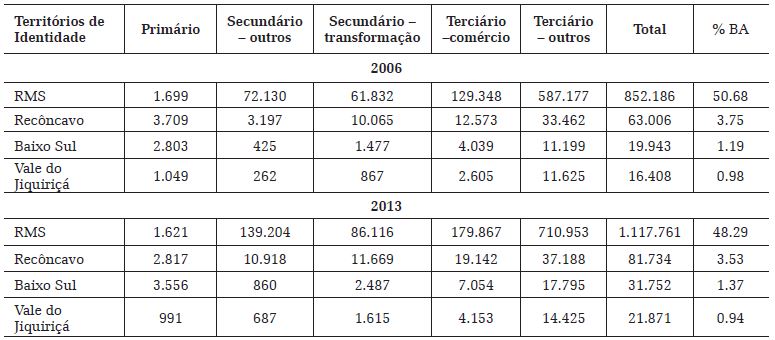 A Tabela 3 mostra a distribuição dos empregos formais por grandes setores de atividades nos quatro territórios, com base na RAIS, Estabelecimentos de 2006 e 2013.11 Nota-se, em primeiro lugar, a grande concentração dos empregos na RMS (50,6%, em 2006, e 48,29%, em 2013, do total do Estado), maior do que a concentração do PIB, de 40,9%, em 2012 (Tabela 2), e bem menor do que a concentração da população, de 24,9%, em 2014 (Tabela 1). Em segundo lugar, a distribuição percentual do emprego entre os grandes setores é diferenciada por território: em 2006, enquanto na RMS os empregos no setor primário respondiam por menos de 0,2% do total do território; nesse mesmo ano, no Baixo Sul, esse percentual atingia 14% e 6,4% no Vale do Jiquiriçá. Já os empregos na indústria de transformação no Recôncavo, também em 2006, abarcavam 16% do total, enquanto, no Baixo Sul, era de 7,4%; na RMS, 7,2%, e, no Vale do Jiquiriça, 5,3%. Nesse mesmo ano, o setor terciário, incluindo o comércio e outros, somava 83,2% de todos os empregos formais nos quatro territórios, sendo que na RMS atingia 84%, o maior percentual, e no Recôncavo 73%, o menor.
