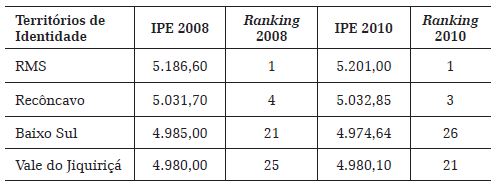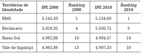 A Tabela 9 exibe os Índices de Performance Social (IPS) dos quatro territórios16, calculados pela média dos índices de cada município. Verifica-se uma situação semelhante ao do IPE, com a diferença que o Baixo Sul e o Vale do Jiquiriçá estão mais bem ranqueados no índice social do que no econômico. Porém o Baixo Sul foi rebaixado no ranking, de 2008 para 2010, enquanto o Vale de Jiquiriçá ascendeu. Enquanto todos os 10 municípios da RMS alcançaram, em 2010, IPS acima de 5000,17 dos 20 do Recôncavo, apenas 6 obtiveram tal escore. Já dos 14 do Baixo Sul, 8 ficaram abaixo desse nível e dos 21 do Vale do Jiquiriçá, apenas 10 superaram o nível de 5000 em 2010.