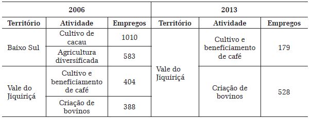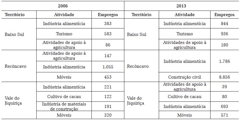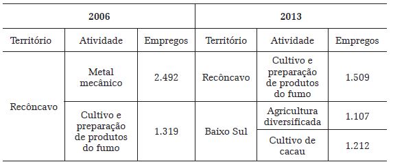 Para os quatro Territórios de Identidade em tela, foram identificadas as aglomerações produtivas nos anos de 2006 e 2013, permitindo uma análise da evolução de suas principais atividades. A Tabela 5 relaciona os núcleos de desenvolvimento setorial-regional. Verifica-se que, no período, a metal-mecânica deixou de ser um núcleo de desenvolvimento setorial-regional no Recôncavo, e que o Baixo Sul ganhou duas aglomerações com essas características, indicando um crescimento da importância da sua agricultura para o Estado. A RMS e o Vale do Jiquiriçá não possuíam aglomerações desse tipo.