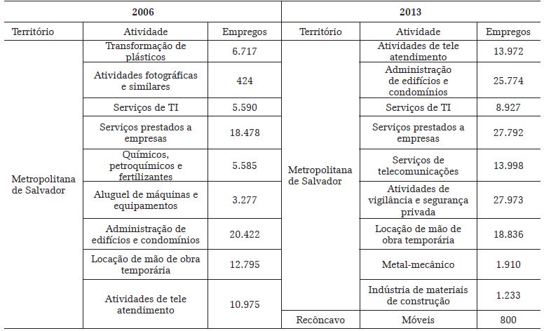 A Tabela 6 mostra os vetores avançados em 2006 e 2013. Como seria de se esperar, a RMS abriga uma considerável quantidade desse tipo de aglomeração. Das 11 aglomerações, em 2006, com exceção da cadeia automobilística e da química, todas eram vinculadas ao setor terciário e totalizavam 84.263 empregos. Já em 2013, não encontramos aglomerações industriais nesse território. No entanto, as nove aglomerações de 2013 empregavam 140.415 pessoas. O Recôncavo, no período, desenvolveu a indústria de móveis que, em 2013, empregava 800 pessoas nesse território.