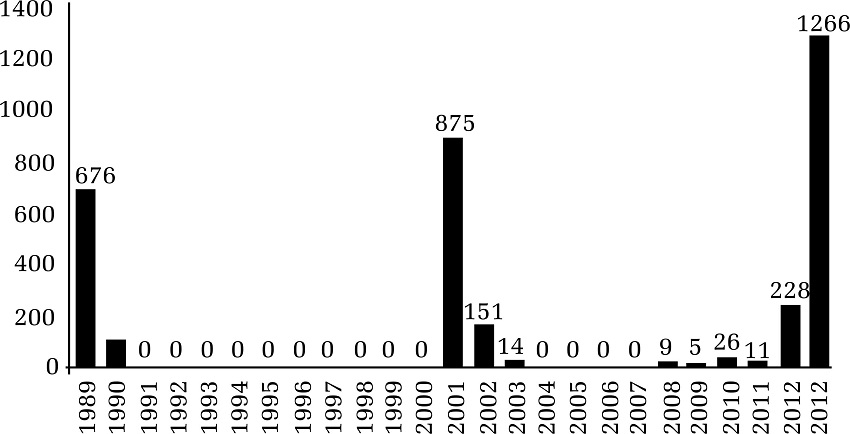 Aunque las bases de datos disponibles sobre el fenómeno en la Argentina difieren en la cuantificación del mismo, los datos agregados permiten asociar a los saqueos a tres “picos” de visibilidad transcurridos en 89-90, 2001-2002 y 2013. En este sentido, los registros de “Nueva Mayoría9” (2013) señalan que, para el período 1989 y 2013, han tenido lugar 3356 casos de saqueos, situando en el contexto del “estallido de la hiperinflación” (1989) unos 676 casos; en el “estallido de la convertibilidad” (2001) 875 casos;10 a los cuales se suman 151 saqueos ocurridos las primeras semanas de 2002. En el periodo posterior, los saqueos tienen baja frecuenta (2003: 14 casos; 2008: 9 casos; 2009: 5 casos; 2010: 26 casos; 2011: 11 casos) hasta diciembre de 2012. Ese mes, los saqueos se inician en Bariloche, extendiéndose a varias provincias, alcanzando un pico relativo de 228 casos. En 2013, el fenómeno adquiere nuevamente mayor magnitud, contabilizando un total de 1266 casos (superando los picos anteriores).