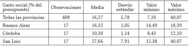 El porcentaje del presupuesto que las provincias asignan como gasto social varía ampliamente entre ellas: el valor mínimo (7,2 por ciento, correspondiente a Entre Ríos) es 5,6 veces más baja que el valor máximo (40,1 por ciento, correspondiente a San Luis). La media para todas las provincias en los años de la serie es de 16,3 por ciento y la desviación estándar es 5,8 por ciento, casi la mitad de la media. El valor promedio de toda la serie para San Luis y la ciudad de Buenos Aires es ligeramente superior al 28 por ciento. Estos valores son tres veces mayores que los de las provincias en el otro extremo de la distribución: Córdoba y Entre Ríos tienen una media para la serie ligeramente superior al 10 por ciento (Ver Tabla 1 y Figura 1).