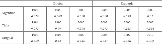 O coeficiente de Gini da Argentina, na década de 1990, aumentou substantivamente, como pode ser visto na tabela, chegando a 0,578 em 2002, num período pós-crise. Entretanto observa-se uma queda desse indicador pós-entrada da esquerda, alcançando, em 2009, um Índice de 0,510. Nos demais países, observa-se a mesma tendência de queda do Índice de Gini, ou seja, um aumento durante os governos conservadores e uma diminuição progressiva após a entrada dos governos de esquerda. Expressando essa tendência, o Chile apresenta reduções menores, ou seja, as ações ali implementadas tiveram menor poder redistributivo. Ainda assim é importante observar que, se a diminuição da pobreza no Chile já vinha ocorrendo desde os governos anteriores, nos governos de esquerda, houve uma mudança na tendência redistributiva, distinta do padrão nos governos da década de 90. Por fim, o Uruguai sempre se destacou, na América Latina, por apresentar, historicamente, um dos menores Índices de Gini, como pode ser visto na Tabela 8.