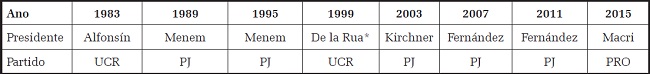 Essa trajetória contrasta com a da Argentina. Mesmo com o fim da ditadura, houve a continuidade do Partido Justicialista no poder, em seus vários matizes ideológicos. O período democrático iniciou-se com um cenário bipartidário, com a presença da União Cívica Radical (UCR) e do Partido Justicialista (PJ), o que Chasquetti denomina, na Argentina, de multipartidarismo moderado. Houve também quatro administrações federais no regime democrático, antes que um governante classificado como de esquerda chegasse à presidência.