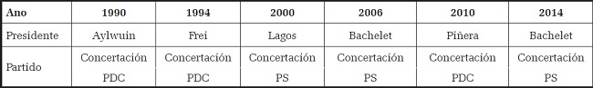 O Chile foi o país que mais demorou a iniciar o regime democrático, e a coalizão de governo, a Concertación, opera com uma variação interna entre esquerda e direita mas, pelo tempo no governo, mostra a sua força. A Concertación foi formada muito mais pela necessidade de união de forças contra a ditadura, contra os princípios de um regime autoritário, do que por uma identidade interna de projetos políticos. Internamente, os partidos possuem estruturas e institucionalidades próprias, com vieses ideológicos distintos. Fato é que nenhum partido, desde então, contou com maioria do eleitorado, necessitando sempre da formação de coalizão (Cf. Albala, 2009; Garretón, 2000).