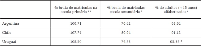 Argentina, Chile e Uruguai sempre se destacaram em termos de política de educação quando comparados a seus vizinhos. Durante todo o século XX, esses países apresentaram um sistema educacional público com os maiores níveis de gastos sociais e cobertura da região, sendo que a política de educação foi a primeira a alcançar o status de universalidade, enquanto o restante das políticas sociais estava atrelado ao emprego formal (Cf. Filgueira, 2005). Dessa forma, o setor de educação, nesses países, apresentou um quadro similar, uma vez que, em todos eles, desde a década de 80, havia mais de 90% de alfabetização, e as matrículas, na escola primária, já eram universalizadas (Tabela 4). Todos eles partem de padrões de oferta bem acima dos praticados na área da saúde.