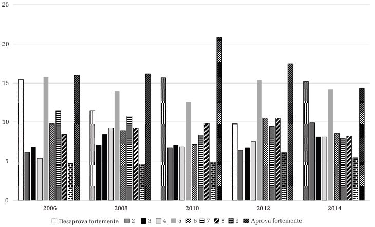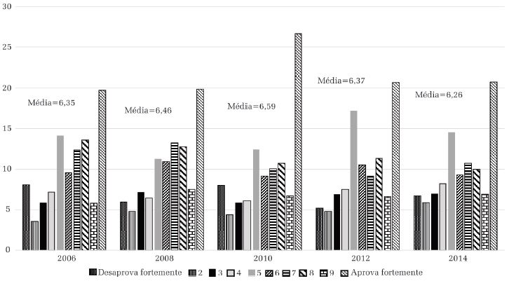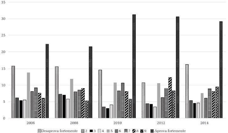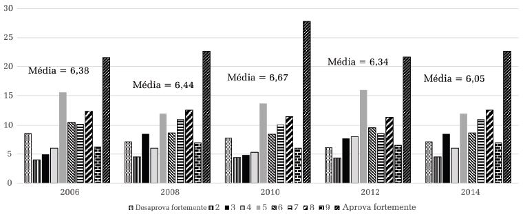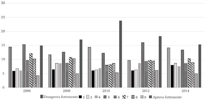 Na terceira medida, que avalia a aprovação do direito desse grupo a concorrer a cargos públicos, observamos as menores medias até o momento, nunca se atingindo o ponto 6. É marcante a diferença de concentração na comparação com as duas variáveis anteriores, pois, nos anos de 2006, 2008 e 2014, a coluna dos que aprovam “totalmente” (ponto 10 da escala) rivaliza em tamanho com o ponto mínimo (1) e o intermediário (5). De forma semelhante ao observado anteriormente, constatamos queda em 2014, tanto na média quanto no percentual de indivíduos no polo positivo da escala.