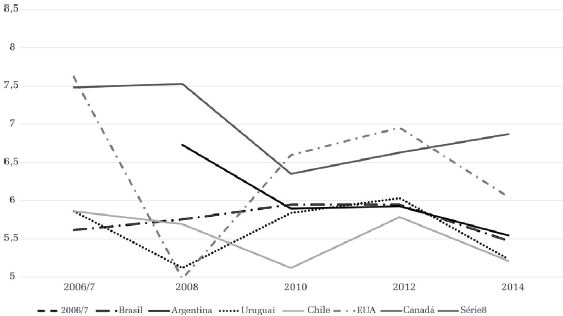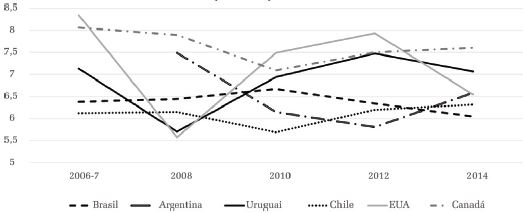 Podemos perceber que esse padrão se repete entre os demais países latinos, incluindo o Uruguai, que, nas primeiras variáveis, se aproximava mais do Canadá. A trajetória da Argentina chama a atenção, pois, apesar de manter a primeira posição entre os vizinhos em todo o período, sofre queda considerável e tem sua média reduzida de 6,67 para 5,53. No que diz respeito a Canadá e EUA, o comportamento é bastante semelhante à variável anterior, ou seja, apresenta médias inferiores às verificadas nos dois primeiros indicadores.