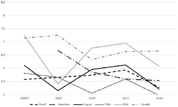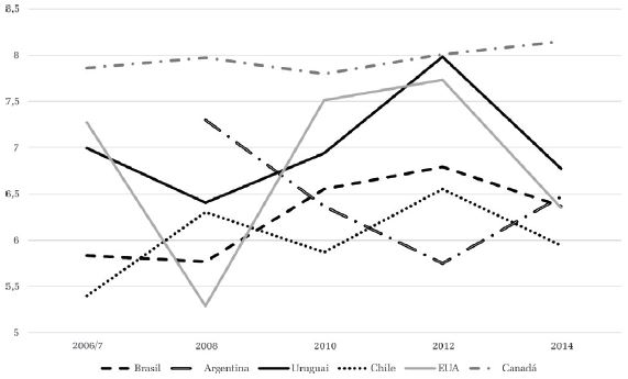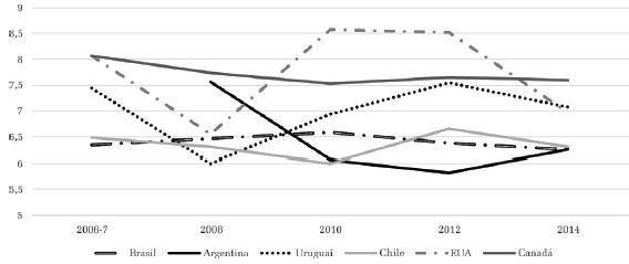 A comparação com os cinco países selecionados revela particularidades relevantes (Gráfico 10). A primeira delas diz respeito à trajetória errática do Uruguai, que chega a atingir nível de aprovação semelhante ao canadense em 2012 e, no momento seguinte da pesquisa, desce para os patamares de seus vizinhos latinos, apesar de continuar ocupando a primeira posição nesse grupo. O segundo destaque fica por conta dos EUA, que novamente parece se agrupar melhor entre os países da parte sul do continente, especialmente em razão de forte queda entre 2012 e 2014. O destaque positivo fica por conta do Canadá, que mantém médias próximas de 8 ao longo de toda a série e atinge 8,15 em 2014.