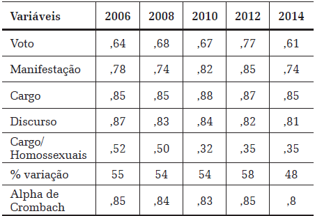 Utilizando a técnica dos grupos identificados, o LAPOP é a única fonte de informações sobre tolerância política entre os brasileiros. Como já apontamos anteriormente, esse procedimento tem sido fortemente criticado pela sua aplicação indistinta a todos os entrevistados, inclusive os que eventualmente se identificam com o grupo mencionado na pergunta (Sullivan; Piereson; Marcus, 1982). Em seu questionário, essa pesquisa insere um grupo bastante genérico e ampliado de “pessoas que falam mal da forma de governo”, e os entrevistados devem apontar seu grau de aprovação ao exercício de direitos políticos fundamentais: votar, manifestar publicamente, concorrer a cargos públicos e discursar.