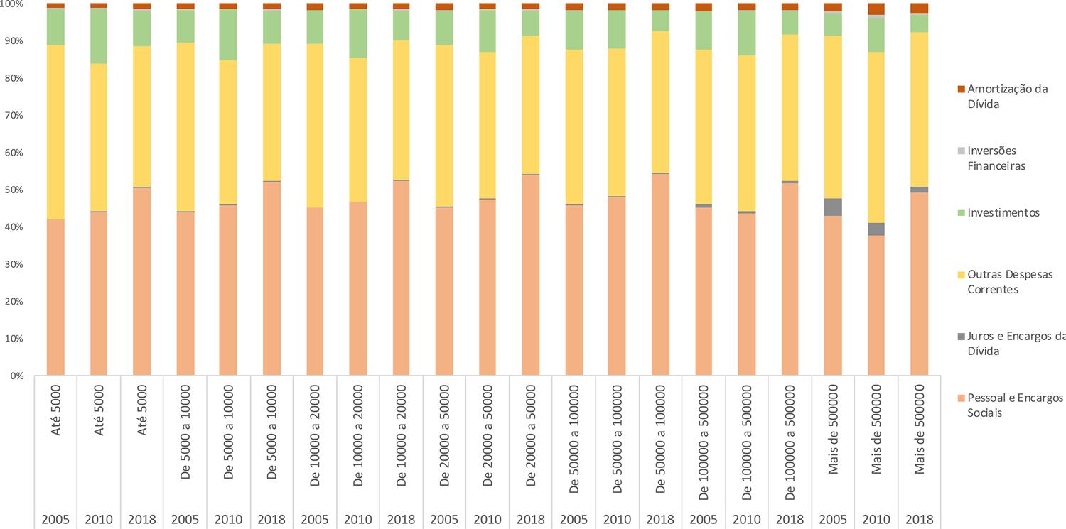 Os dados orçamentários dos municípios brasileiros entre 2005 e 2018 permitem mostrar a relevância e o aumento do peso orçamentário da setorialização de políticas públicas neste período. O gráfico 1 , indica, ao longo das últimas décadas, um crescimento intenso de alguns sistemas de políticas públicas em todos os extratos municipais, isto é, tanto em municípios de pequeno porte quanto nas grandes cidades e capitais (mais de 500 mil habitantes). Há uma concentração orçamentária em torno das despesas de Educação e Saúde, que em vários casos chegam a ocupar mais da metade do orçamento anual dos municípios.
