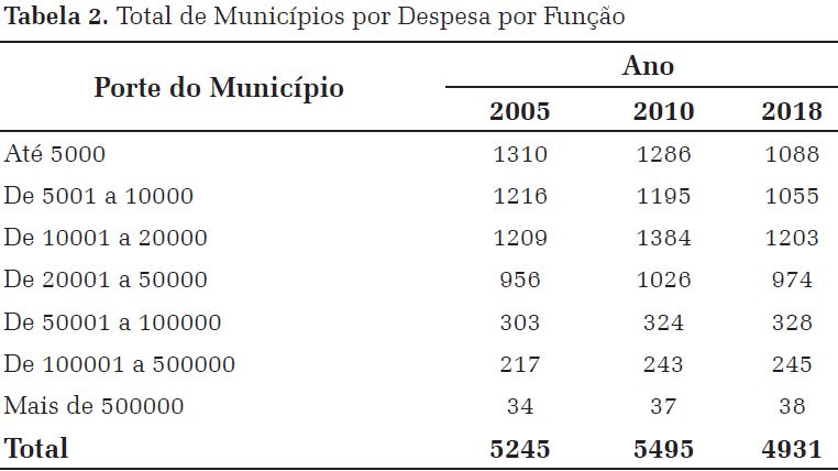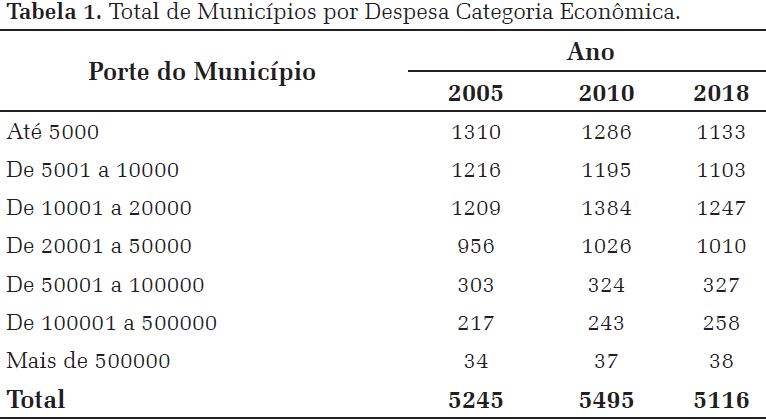 Para uma análise mais adequada, considerando a grande heterogeneidade dos municípios brasileiros, estes foram agrupados por porte populacional: i) até 5000 habitantes; ii) de 5001 a 10000 habitantes; iii) 10001 a 20000 habitantes; iv) 20001 a 50000 habitantes; v) 50001 a 100000 habitantes; vi) 100001 a 500000 habitantes e v) mais de 500 mil habitantes.