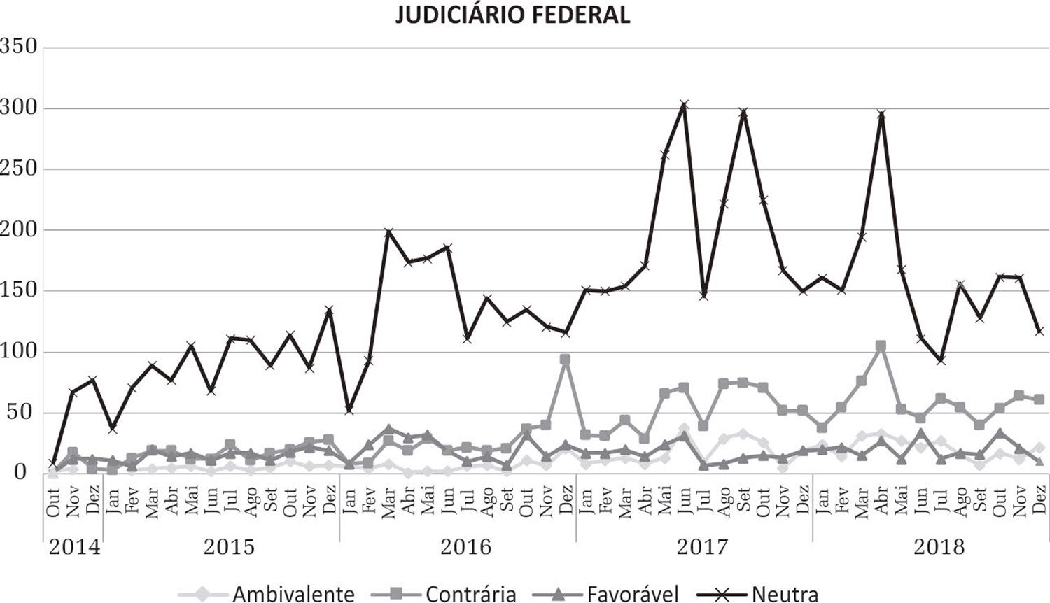 Os picos de presença nos jornais, tanto do Judiciário Federal, como do MPF, estão ligados a momentos cruciais das investigações da Lava Jato: em março de 2015, a Operação comemorava um ano de atividades; já em junho de 2016 havia o debate sobre a possível delação de membros da empreiteira OAS; e finalmente em maio de 2017, maior pico da cobertura neutra, observamos diversos movimentos da Operação como a divulgação de contradição no depoimento do ex-presidente Lula ao então juiz federal Sérgio Moro.