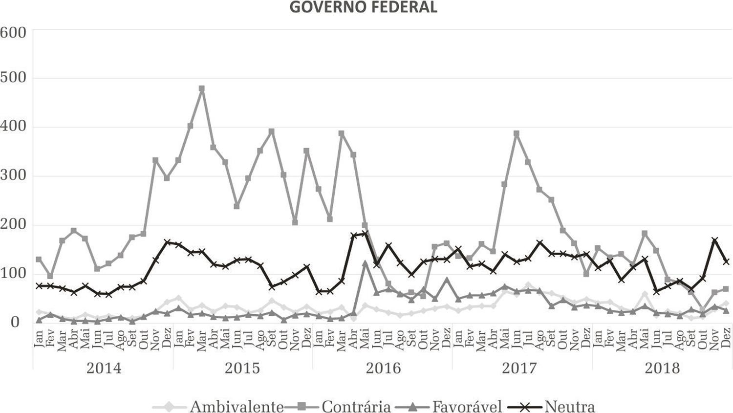 Temos aqui um padrão bastante diverso daquele mostrado nos gráficos sobre as instituições do Sistema de Justiça. Primeiro porque aqueles revelavam uma tendência consistentemente ascendente, enquanto o perfil da cobertura – observado tanto pelo número absoluto de matérias sobre o tema quanto pela proporção entre as valências favorável, contrária, neutra e ambivalente – se altera significativamente durante o período. Do começo da série até maio de 2016 temos um crescimento consistente do número de matérias, só que, ao contrário das instituições judiciais, no caso do Governo Federal as contrárias dominam com ampla margem. Para se ter uma ideia da diferença, enquanto para aquelas instituições há algo em torno de 10 codificações neutras para uma contrária, para o Governo Federal há, da posse de Dilma até seu afastamento da Presidência, em média duas contrárias para uma neutra.