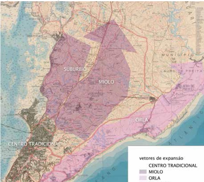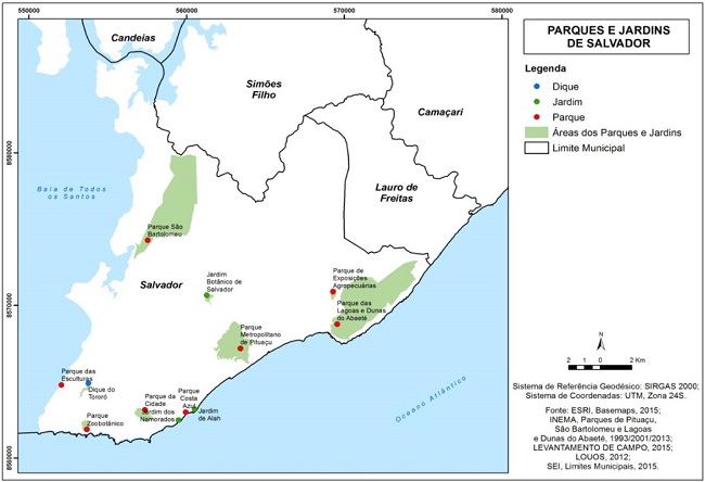 A cidade de Salvador contemporânea se oferece aos seus habitantes de maneira desigual e fragmentada, numa espécie de disputa entre a sua geografia de espaços privados e a sua geografia pública, que é formada por um conjunto de espaços programados para uso público, como praças, largos e parques, além das ruas, e espaços naturais, que se convertem em lugares públicos, como as praias por exemplo. Nesse sentido, a geografia de usos e práticas desses espaços assume dimensões distintas entre os diversos grupos sociais e está associada a um conjunto de limitações e especificidades. Uma primeira dimensão relevante é a distribuição desses espaços no território da cidade, que é bastante desigual. Em geral, os espaços públicos se localizam nas áreas mais centrais e no vetor de expansão mais valorizado da cidade. Através da comparação entre a Figura 2 , que apresenta os principais vetores de crescimento de Salvador desde a década de 1970 (a Orla Atlântica Norte, reduto de grupos de maior renda, e o “Miolo” e o Subúrbio Ferroviário, que concentram principalmente grupos populares) e as Figuras 3 e 4 , que apresentam a distribuição dos parques, jardins, praças e largos de Salvador, é possível identificar a desigualdade intraurbana da geografia pública de Salvador.