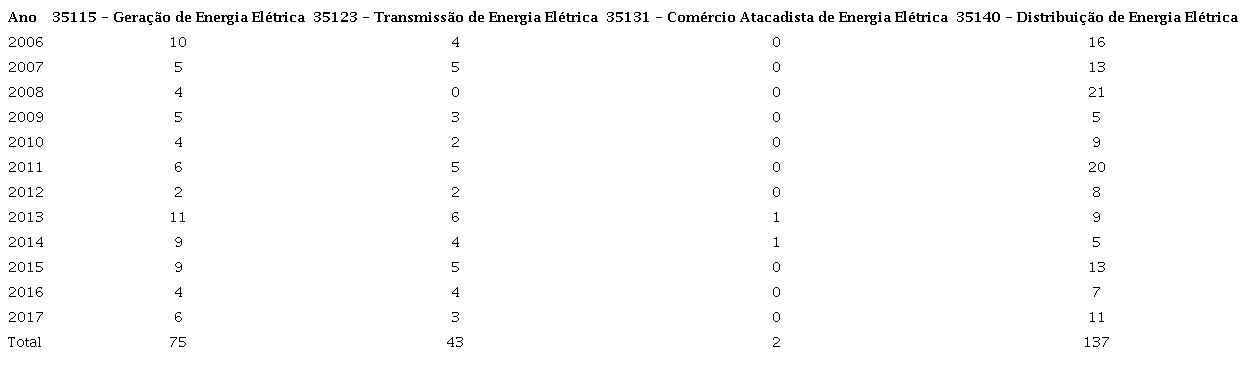 Conforme observa-se na Tabela 4 , com informações mais desagregadas, os dados extraídos da previdência social por meio da CNAE 2.0 mostram que o número de acidentes fatais no setor elétrico brasileiro obedece a certa tendência de continuidade ao longo dos anos, com alguns picos e variações quanto ao número de acidentes durante a série histórica apresentada. Segundo os dados da Tabela 4 , a maioria dos acidentes fatais do setor elétrico nacional ocorre na atividade de distribuição energética que soma 137 mortes de trabalhadores no Brasil na série de 2006 a 2017. Isso se deve, sobretudo, ao fato de que na atividade de distribuição energética se concentra a maior parte de trabalhadores do setor elétrico, tanto em números absolutos – incluindo próprios e terceirizados – como na proporção com os outros setores de atividades das empresas.