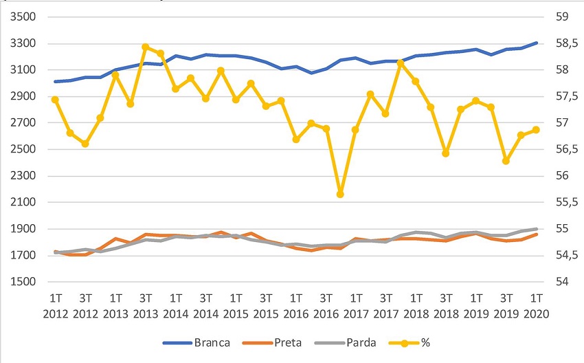 Fundada na colonização do território americano e na acumulação de capital no espaço Atlântico, a desigualdade racial no Brasil continua endêmica. Ao observar a distribuição percentual dos brasileiros por cor ou raça, verifica-se que 56,3% da população brasileira é preta ou parda. Como apresenta Santos (2009 , p. 51), “homens e mulheres não brancos sofrem de um elevadíssimo componente de desigualdade de acesso a contextos de raça no Brasil”. Se olharmos, contudo, aqueles entre os 10% com menores rendimentos, apenas 21,9% dos brancos se situam nessa posição, ao passo que 77,0% dos pretos ou pardos estão nessa posição. Quando consideramos brasileiros entre os 10% com maiores rendimentos, a situação é inversa, ou seja, 70,6% são brancos e 27,2% pardos ou pretos, o que indica que a pobreza no Brasil está relacionada ao fenômeno raça/etnia. Osório (2019 , p. 3) indica que, embora tenha sido afetada pela queda na desigualdade entre 2004 e 2014, a desigualdade racial brasileira continua “elevadíssima. […] Em 2014, a chance de pretos serem pobres ainda era 2,1 vezes maior do que a dos brancos, enquanto a dos pardos permanecia alta, 2,6 vezes maior”.
