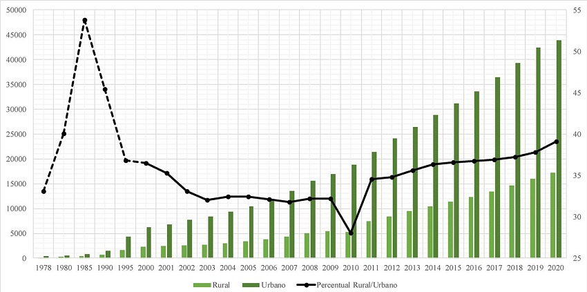A política de reforma e abertura primeiro afetou a desigualdade urbano-rural na China a partir dos anos 1980. Como indicado no Gráfico 3 , a redução da pobreza rural e a possibilidade de aumento de renda por meio do trabalho urbano e industrial promovidos até 1992 possibilitaram uma elevação inicial na renda média chinesa, notadamente no meio rural. As reformas estruturais dos anos 1990 reverteram esse processo (Huang, 2009), indicando a retomada da renda média urbana.