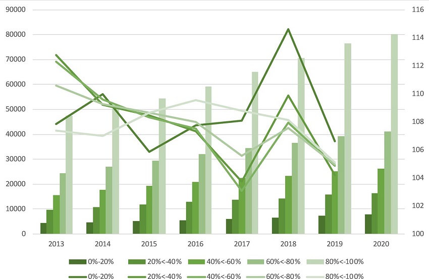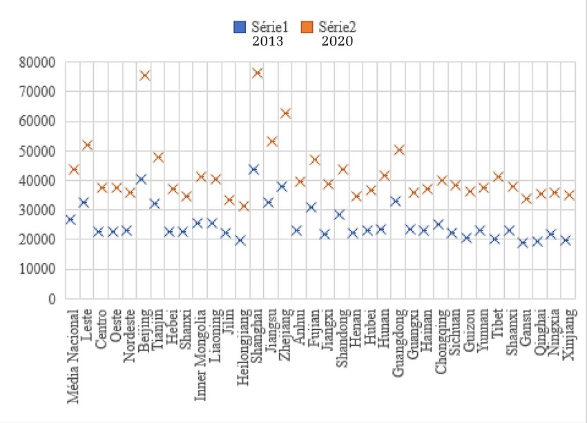 A continuidade do crescimento da renda média na China também foi possível graças à ampliação da produtividade durante o percurso do processo de reforma e abertura ( Hu et al., 2021 ). Após a crise econômica de 2008, a redução na capacidade de consumo dos países de economia capitalista central foi domesticamente compensada pela ampliação da renda média chinesa ao longo da década de 2010. Gaulard (2015) e Li (2021) apontam que o resultado disso é a conversão da China em um país de renda média.