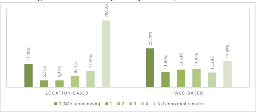 Observa-se, no Gráfico 1 , uma maior percepção de medo diante da possibilidade de exclusão ou bloqueio entre trabalhadores de plataformas location-based , se comparados aos seus pares que trabalham em plataformas web-based .