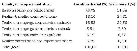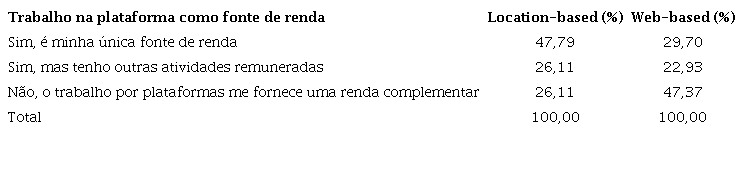 Fonte: Elaborado pelos autores.Outra constatação importante diz respeito ao grau de dependência que os trabalhadores estabelecem com as plataformas. Os trabalhadores na modalidade location-based que dependem exclusivamente da renda das plataformas somam 47,79%, enquanto os web-based são 29,70%, indicando que a maioria destes trabalhadores usam a plataforma preferencialmente como complemento de renda, conforme a Tabela 9 .