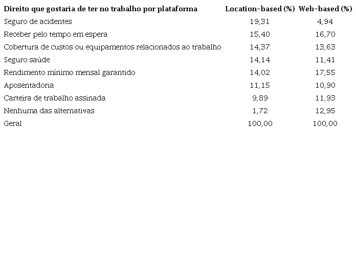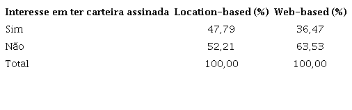 Quando perguntados se gostariam de obter registro formal de contrato trabalhista, com carteira de trabalho, os trabalhadores da modalidade location-based manifestam uma divisão entre a preferência pela manutenção da relação de autônomo (52,21%) e a formalização do vínculo de emprego (47,58%). Entre os trabalhadores web-based , a maioria (63,53%) prefere se manter como autônomo, conforme a Tabela 11 . Esses dados precisam ser interpretados com cuidado, haja vista os pressupostos considerados pelos trabalhadores para se chegar a tal conclusão, por exemplo, a hipótese de que eles possam valorizar aspectos da flexibilidade de horários, os quais acreditam contrariar a formalidade da relação de emprego. Ou seja, podem ter uma compreensão imprecisa acerca de uma suposta incompatibilidade entre flexibilidade de horários e relação de emprego.