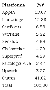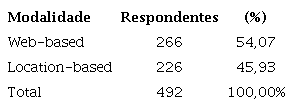 Entre os respondentes, 266 apontaram como principal plataforma de trabalho uma que se enquadra na modalidade web-based . Os demais 226 indicaram trabalhar em plataforma location-based , conforme a classificação ( Tabela 1 ). 2