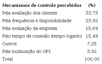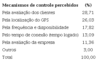 Os mecanismos de controle, no entanto, não são homogêneos. Há substancial dissociação de compreensão entre os trabalhadores web-based e os trabalhadores location-based quanto aos meios de avaliação e controle exercidos pelas plataformas. A pesquisa mostra que, no trabalho nas plataformas da modalidade location-based , há a presença e conjugação de pelo menos quatro mecanismos de controle: avaliação de cliente, localização, frequência e tempo de conexão, com uma intensidade maior para a avaliação por clientes (28,71%) e a localização pelo Sistema de Posicionamento Global (GPS) (26,03%), como se pode observar da Tabela 4 .