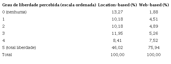 Quando perguntados sobre o grau de liberdade de recusa de tarefas, quase metade (46,02%) dos trabalhadores de plataformas location-based que responderam ao questionário, indicaram perceber uma ampla liberdade para recusar tarefas, enquanto nas web-based esse percentual é superior (75,94%). Destaca-se uma proporção significativa de trabalhadores da modalidade location-based que indicaram nenhuma ou pouca liberdade (escala de 0 a 3). No entanto, não é possível afirmar como insignificante a proporção de trabalhadores web-based que responderam não possuir nenhuma ou pouca liberdade ( Tabela 6 ).