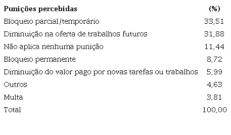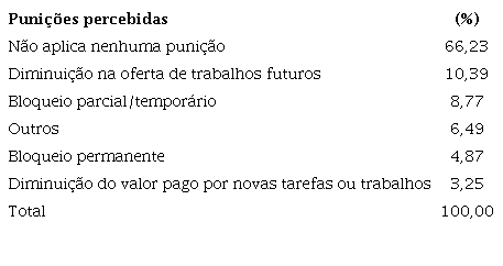No entanto, as respostas para a pergunta sobre as possíveis punições percebidas em caso de recusa da tarefa, sobretudo entre trabalhadores de plataformas location-based , apontam como consequências os prejuízos com a diminuição na oferta de trabalhos futuros e bloqueios parciais, temporários e permanentes ( Tabela 7 ).