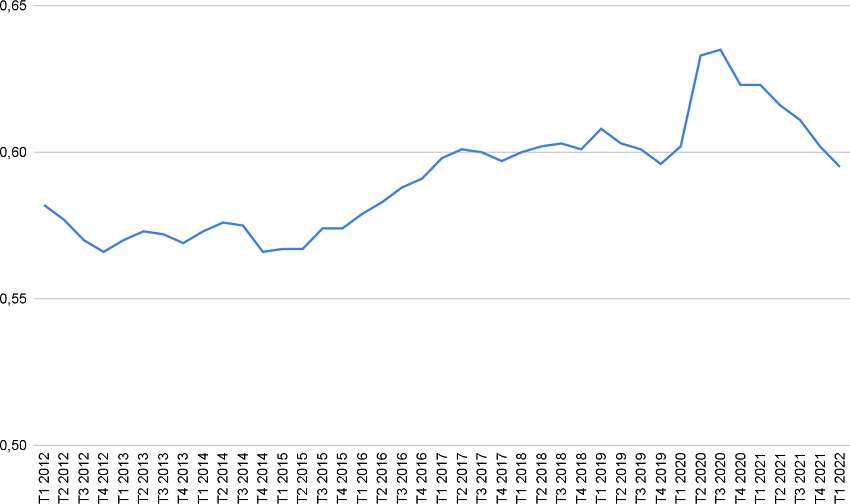 Na Região Metropolitana de Porto Alegre, o Coeficiente de Gini piorou nos últimos anos, ainda que de forma mais intensa entre 2020 e 2021. No primeiro trimestre desses dois anos, o Coeficiente de Gini passou de 0,589 para 0,613. Embora caia entre o primeiro trimestre de 2021 e o primeiro trimestre de 2022 de 0,613 para 0,594, este último patamar ainda é superior ao de antes da pandemia, denotando piora das condições de distribuição de renda nessa região.