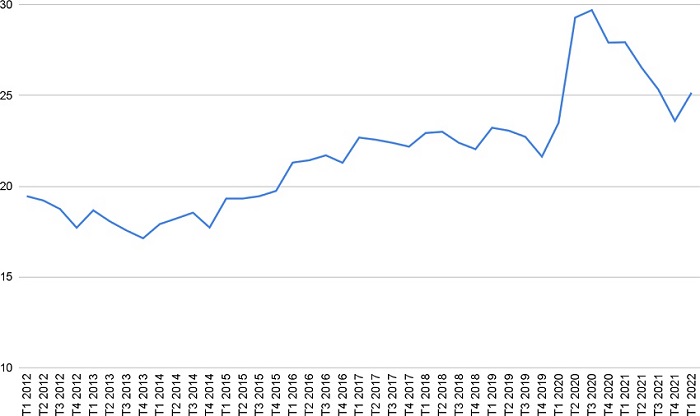 O percentual dos indivíduos vivendo em domicílios com rendimento per capita mensal de até ¼ de salário-mínimo se elevou de 16,5% no primeiro trimestre de 2020 para 19,2% no primeiro trimestre de 2022, tendo atingido seu pico no primeiro trimestre de 2021, com 22,7% da população nessa condição de pobreza.