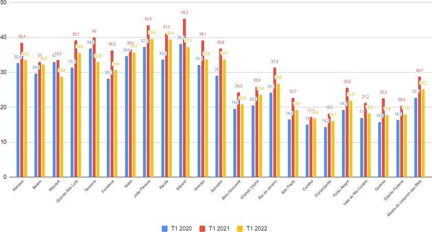 Nessa RM, o percentual dos indivíduos vivendo em domicílios com rendimento per capita mensal de até ¼ de salário-mínimo cresceu de 16,3% no primeiro trimestre de 2020 para 17,9% no primeiro trimestre de 2022, atingindo pico de 20,4% no primeiro trimestre de 2021.
