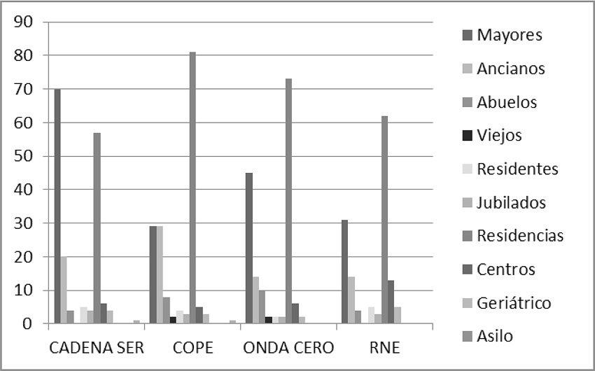 Las cuatro cadenas presentan homogeneidad en el uso de palabras clave, decantándose por la aparición de “mayor/es” y “residencias” y no considerando el tratamiento del concepto, con niveles muy bajos de representación. Destaca el empleo de COPE, que iguala “mayores” a “ancianos” ( Gráfico 1). En cuanto a las palabras clave de personas, resalta la SER, que emplea más las palabras que designan personas que las que designan espacios.