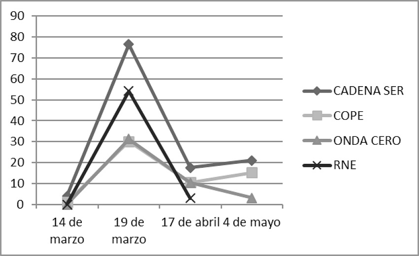 El tiempo dedicado por cada cadena en los días seleccionados para la muestra ( Tabla 2) genera una gráfica que sitúa a la SER en el primer puesto, seguida por COPE, Onda Cero y que se cierra con la caída brusca del pico de RNE ( Gráfico 2). Los días de mayor concentración de presencia son, por este orden, 19 de marzo, 17 de abril, 4 de mayo y 14 de marzo.