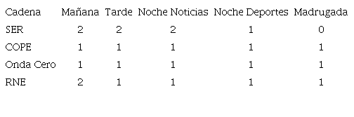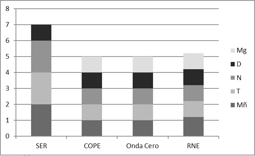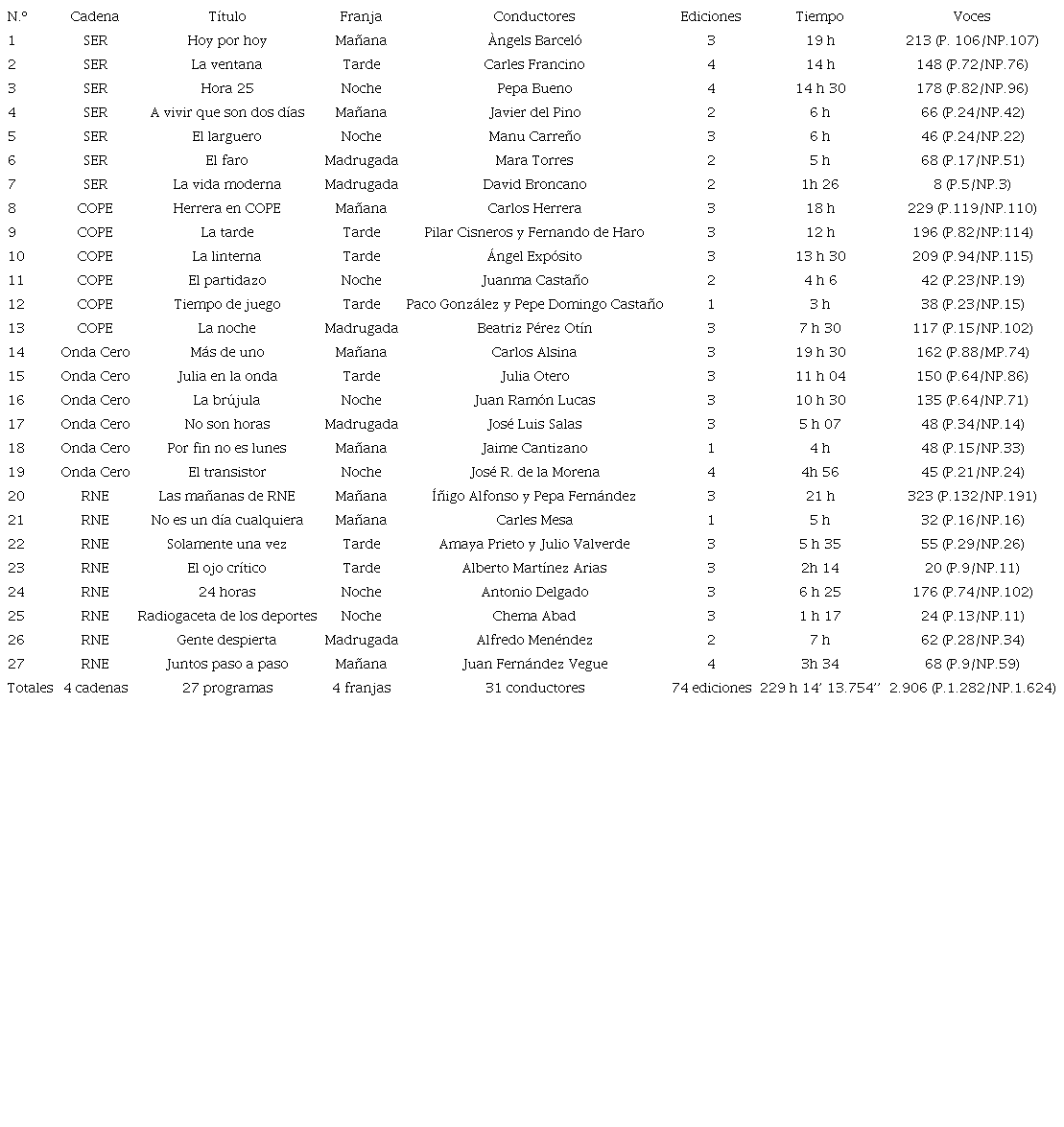 El reparto de horas y voces analizadas por cadena es el siguiente: Cadena SER. 65 h 56’, 727 voces; COPE. 58 h 06’, 831 voces; Onda Cero. 54 h 27’, 588 voces; y RNE. 51 h 25’, 760 voces. La desigualdad de horas analizadas depende de la producción de los programas seleccionados en los días elegidos para la muestra. La cadena SER emitió programas especiales en fin de semana el sábado, 14 de marzo.
