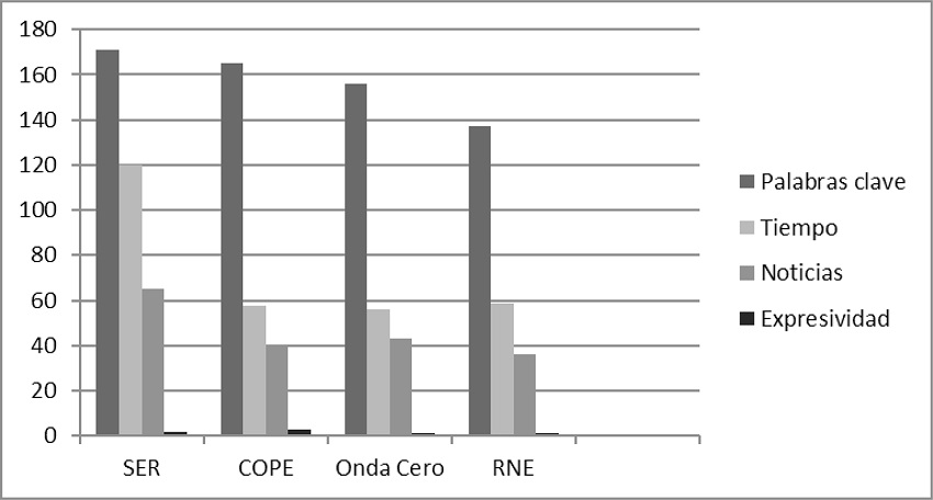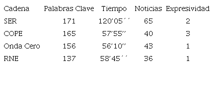 Igual homogeneidad se da entre las emisoras en cuanto a la proporcionalidad de palabras aparecidas y el número de hablantes analizados: SER. 171 palabras para 727 voces; COPE. 165 palabras para 831 voces; Onda Cero. 156 palabras para 588 voces; y RNE. 137 palabras para 730 voces.