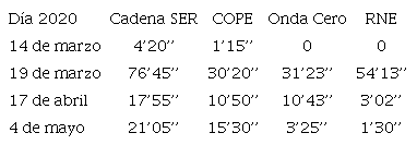 El tiempo dedicado, incluso en los dos días críticos, es muy poco en comparación con el total de horas analizadas, llegando en el mejor de los casos al 1,32% en la cadena SER.