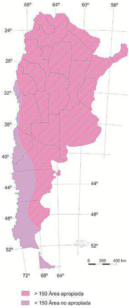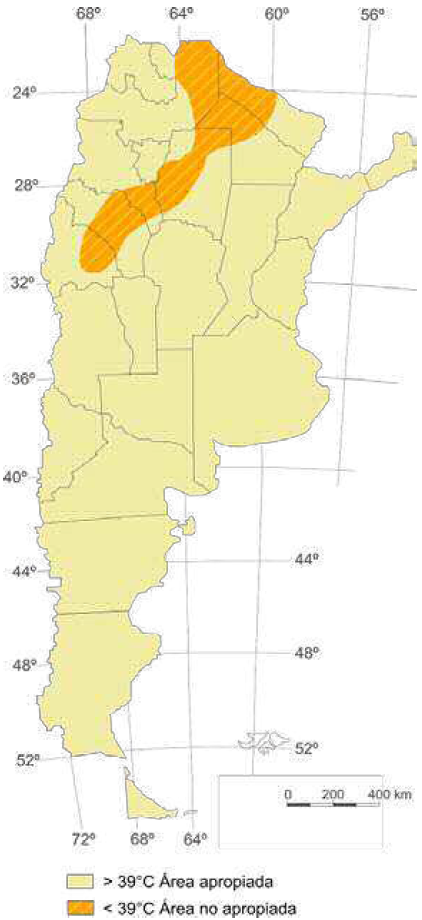 En la figura 3 se muestra la temperatura media del semestre cálido superior a 18 ºC. De la misma se infiere que la mayor parte del país presenta aptitud apropiada. Las áreas no apropiadas cubren el noroeste argentino y gran parte de la Patagonia (sudoeste de Neuquén, oeste de Chubut y la totalidad de las provincias de Santa Cruz y Tierra del Fuego).