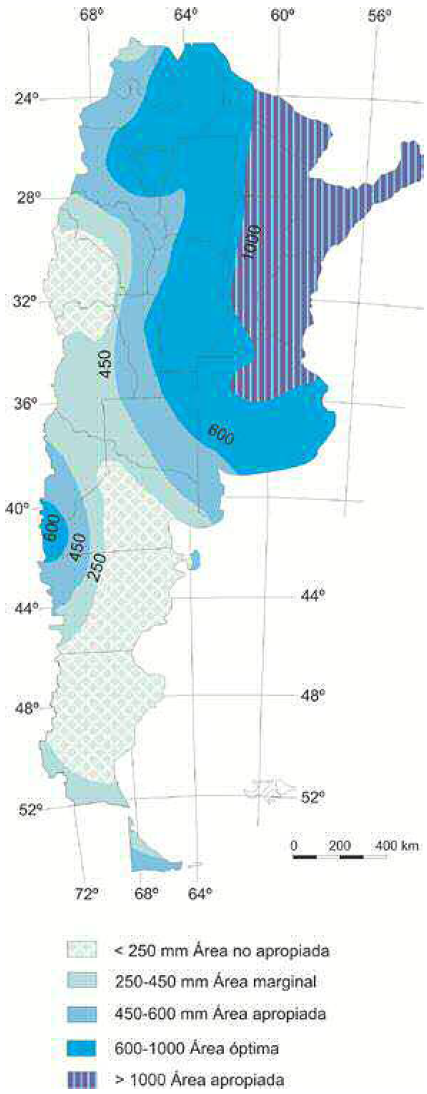 Para analizar las regiones hídricas, se tuvieron en cuenta las isoyetas correspondientes a los 250, 450, 600 y 1.000 mm anuales, calificando como área no apropiada aquella que no alcanza el umbral mínimo de los 250 mm, área marginal cuando se reciben de 250 a 450 mm y área apropiada en el rango de 450 a 600 mm. El rango de 600 a 1.000 mm anuales representa el óptimo de lluvia mientras que precipitaciones superiores a 1.000 mm delimitan otra zona apropiada.