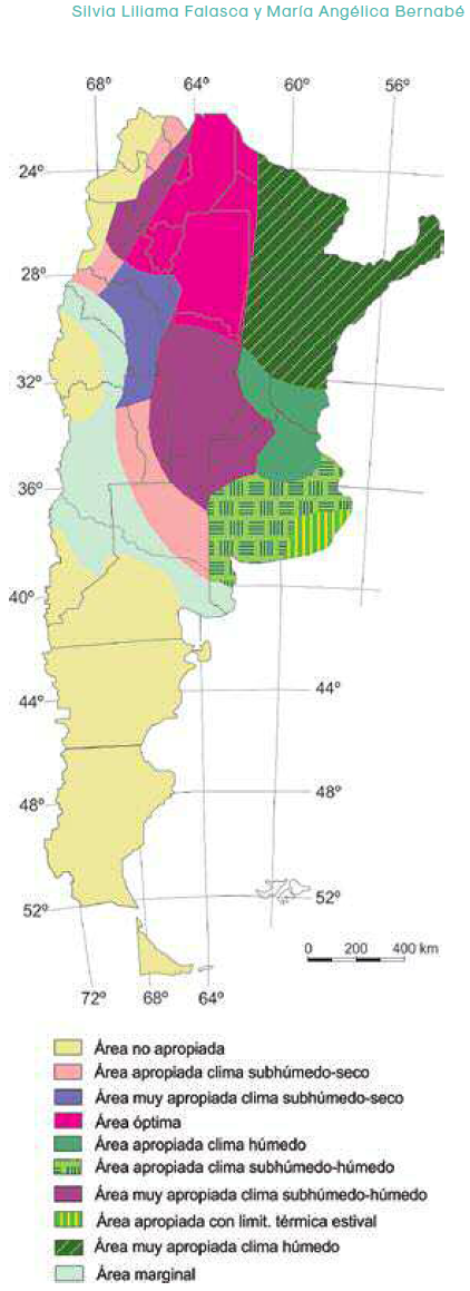 La figura 7 muestra las regiones hídricas, las cuales se diferenciaron en 5 clases de aptitud: no apropiada, marginal, apropiada (clima húmedo), apropiada (clima subhúmedo- seco) y óptima. Las isoyetas al norte de la región Patagónica muestran el gradiente de humedad en el sentido este-oeste debido a la influencia ‘Atlántica’. Las áreas óptimas presentan clima subhúmedo-húmedo y comprenden el norte, noroeste y centro de Argentina, incluyendo la mayor parte de la provincia de Buenos Aires. Hacia el este y hacia el oeste de la zona óptima se delimitan sendas áreas apropiadas, una con régimen húmedo y la otra con régimen subhúmedo-seco, respectivamente.