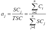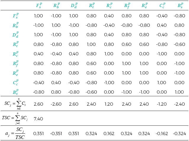 3) Se calcularon los valores ai que resultan de dividir la suma de todos los coeficientes de correlación en cada columna j de la MCC (SCj) entre la suma de todos los SCj (TSC), así: