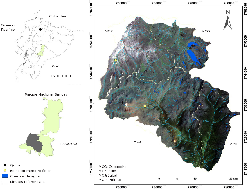 El área de estudio está localizada en una zona de relieve muy irregular, tipo montañoso y escarpado en los Andes ecuatorianos, ubicada en la parroquia Achupallas, en el suroeste del Parque Nacional Sangay, provincia de Chimborazo, Ecuador. Está situada a 300 km al sur de la ciudad de Quito, abarca una superficie de 1.016 km2 que se encuentran en el rectángulo definido por las coordenadas UTM (X= 743089.8; Y= 9760133.5) y (X=782504.2; Y= 9715844.1). En el área se encuentra la red fluvial de cuatro MC identificadas como microcuenca Ozogoche (MCO), microcuenca Zula (MCZ), microcuenca Jubal (MCJ) y microcuenca Pulpito (MCP), (Figura 1).