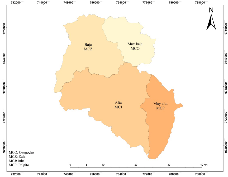 En este estudio se utilizaron mapas de la base cartográfica digital de INFOPLAN (2011). Los mapas tienen escala nacional 1:1.000.000 y contienen capas o shapefile como son cantones, parroquias, vías, ríos, zonas de vida y otros. Estos mapas fueron procesados en un ambiente GIS para extraer el área de estudio, vías, ríos, entre otros. La red natural del sistema de drenaje exhibido en el mapa topográfico fue digitalizado y actualizado usando el modelo digital de elevaciones (MDE) y utilizando herramientas de análisis del programa ArcGis 10.2. Los límites de las MC se delinearon tomando como base la línea divisoria del agua, derivadas del modelo digital de elevación en la caja de herramientas del programa ArcGis 10.2 y, con el conocimiento de la zona por parte de los técnicos expertos, se procedió a definir el punto de desembocadura del rio principal. Así nuestra área de estudio se dividió en cuatro MC.