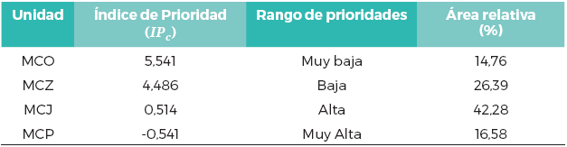 En el cuadro 9 se muestran los valores del Índice de Prioridad calculados usando la ecuación (3). Además, se muestra el rango de prioridad asignado a cada MC en correspondencia con el IPc calculado. Obsérvese, que se le asignó una prioridad alta a la MC con el IPc más pequeño, una prioridad media a la MC con el valor de IPc inmediatamente superior, y así sucesivamente, hasta que se asigna una prioridad muy baja a la MC con el IPc más alto.