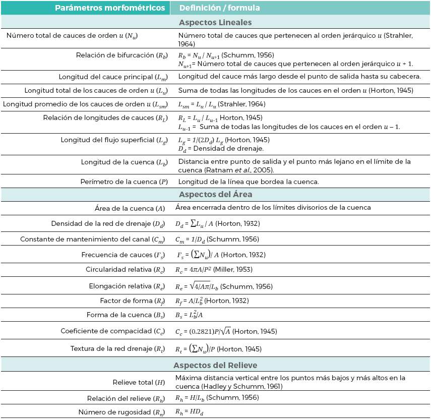 La caracterización morfológica de la geometría de las MC se realizó a través de la cuantificación de: (1) aspectos lineales, (2) aspectos del área y (3) aspectos del relieve. El orden de los afluentes se determinó usando la metodología de Horton (1945) y el orden de los cauces se designó usando el sistema de nomenclatura de Strahler (1957). Los PM primarios: número de afluentes, longitud de afluentes, área, perímetro, longitud del canal principal y longitud de la cuenca se obtuvieron de la capa del sistema natural de drenaje. Los PM para las MC se calcularon usando las fórmulas que se muestran en el cuadro 1 en el ambiente ARC GIS.