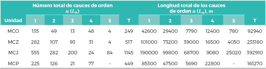 3.1.1.1. Longitud total de los cauces de orden u (Lu): En el cuadro 3 se puede observar que el número de cauces en la MCZ exhibe una relación inversa con el número de orden (menor número de orden - mayor número de cauces), mientras que en las MCO, MCJ y MCP no se cumple esta relación, lo que indica que el flujo de los cauces ocurre desde gran altitud, con variaciones litológicas y pendientes moderadamente empinadas (Nag, 1998; Srinivasa et al., 2004).