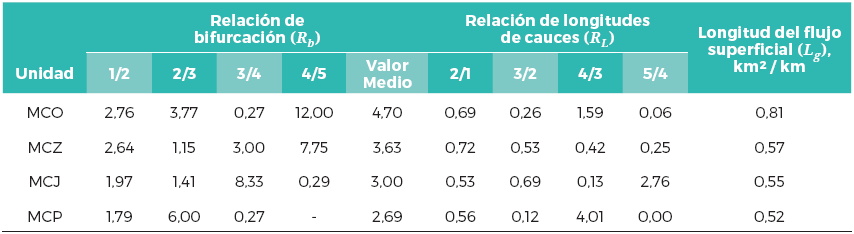 3.1.1.3. Relación de bifurcación (Rb): Los valores promedios del radio de bifurcación son: 4,70 (MCO); 3,63 (MCZ); 3,00 (MCJ) y 2,69 (MCP). Estos valores sugieren que la estructura geológica de las MC en estudio no perturba los patrones de drenaje y que estas MC se encuentran cubiertas por una densa vegetación (Cuadro 4), (Patel & Srivastava, 2015).